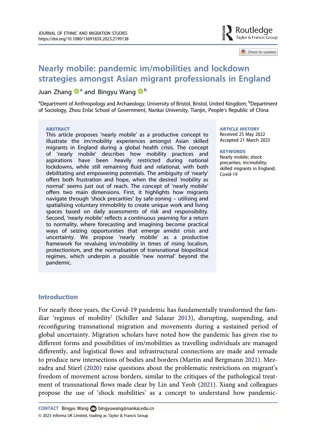 近期,beat365唯一官网周恩来政府管理学院社学系王炳钰教授(作为通讯作者)与布里斯托大学人类学与考古学系张娟副教授的最新合作文章于2023年4月12日在线发表于移民和族群研究顶刊Journal of Ethnic and Migration Studies (JEMS),文章题为Nearly mobile: pandemic im/mobilities and lockdown strategies amongst Asian migrant professionals in England。所发表期刊JEMS为英文核心期刊(SSCI)一区刊物(Journal Citation Reports-Q1);作为移民研究国际权威刊物,JEMS在JCR“族群研究”与“人口学”两个类别均排名世界第1,在谷歌学术“移民研究”和“社会学”两个类别的世界排名分别为第1和第2。本期推文将对这篇文章的研究问题、研究发现以及主要贡献进行介绍。
