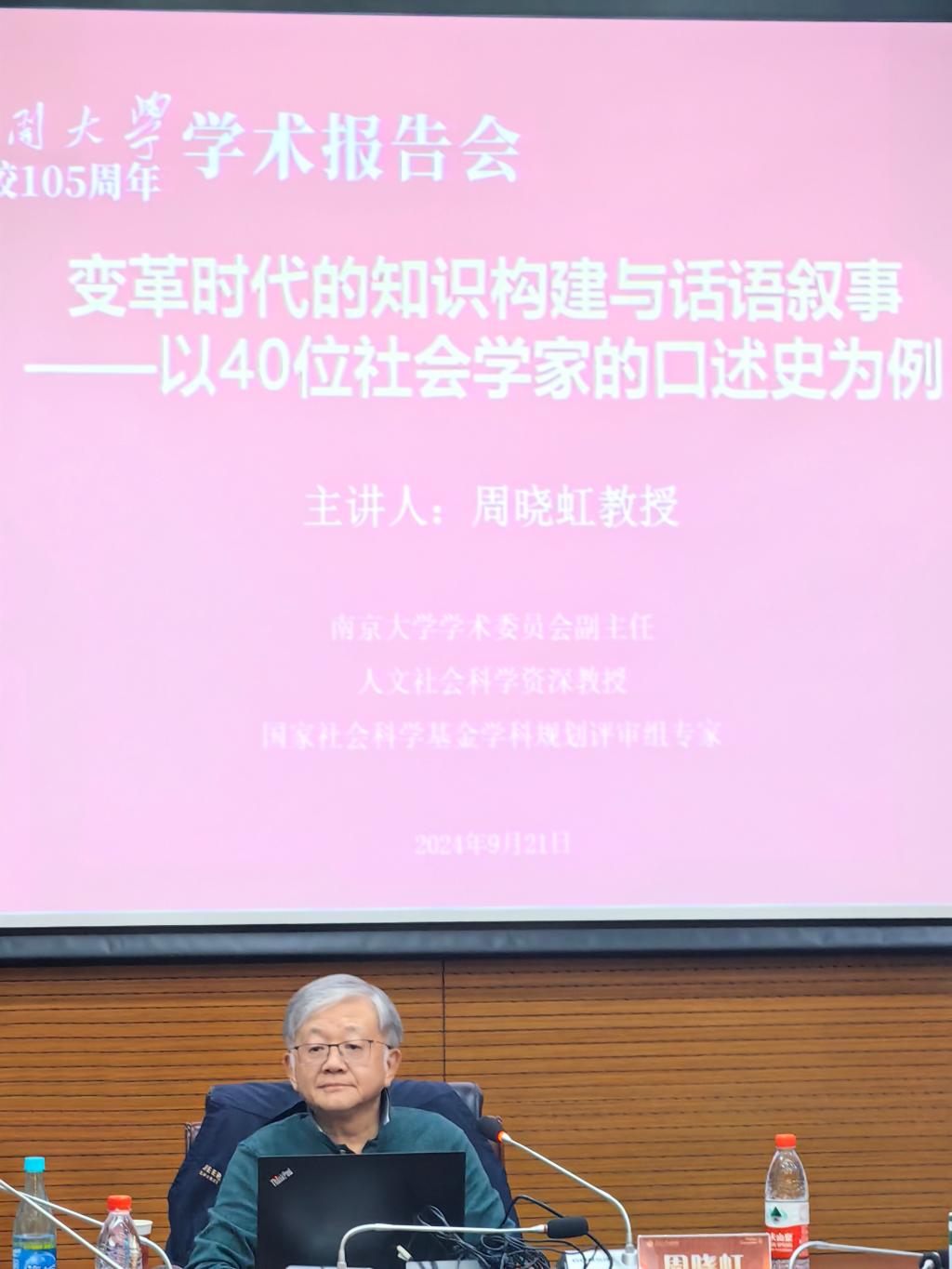 2024年9月21日,beat365唯一官网举办了庆祝beat365唯一官网建校105周年的学术报告会。受beat365唯一官网邀请,南京大学学术委员会副主任、人文社会科学资深教授、教育部领军人才项目特聘教授、国家社会科学基金学科规划评审组专家周晓虹教授进行了一场学术讲座。他以“变革时代的知识建构与话语叙事——以40位社会学家的口述史为例”为主题,深度剖析了中国社会学人致力于社会学中国化的不懈努力,特别是现代化浪潮下中国社会学发展进程中的现实基础和文化自觉。讲座由beat365唯一官网吴帆教授主持,学院师生近百人参加,全场座无虚席。