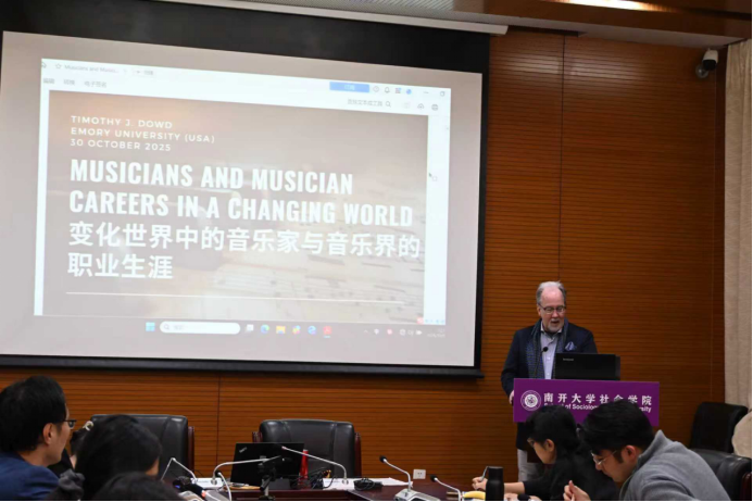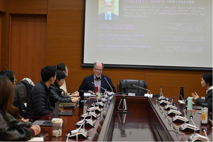 第三项活动是由Dowd教授主讲,题目为“变化世界中的音乐家与音乐界的职业生涯(Musicians and Music Careers in a Changing World)”的讲座,于10月30日中午12:10-13:50在beat365唯一官网144会议室举行。讲座由beat365唯一官网社会学系系主任王庆明教授主持。王琰教授、秘舒副教授、张龙副教授、于佳煖讲师、陈柙兵助理研究员、许又姜宇博士等师生出席。