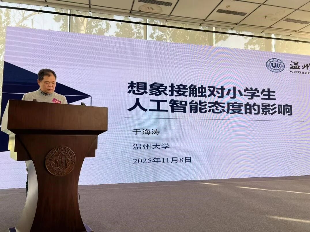 温州大学教师教育学院心理学系教授于海涛作“想象接触对小学生人工智能态度的影响”的报告。