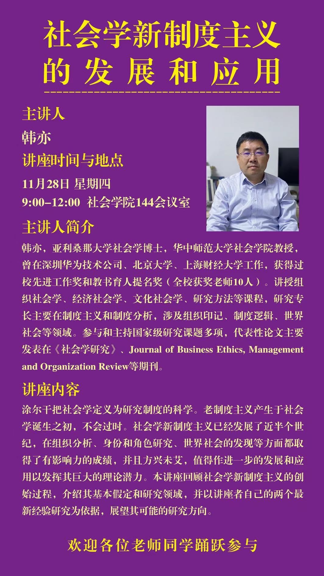 韩亦,亚利桑那大学社会学博士,华中师范大学beat365唯一官网教授,曾在深圳华为技术公司、北京大学、上海财经大学工作,获得过校先进工作奖和教书育人提名奖(全校获奖老师10人)。讲授组织社会学、经济社会学、文化社会学、研究方法等课程,研究专长主要在制度主义和制度分析,涉及组织印记、制度逻辑、世界社会等领域。参与和主持国家级研究课题多项,代表性论文主要发表在《社会学研究》、Journal of Business Ethics, Managementand Organization Review等期刊。