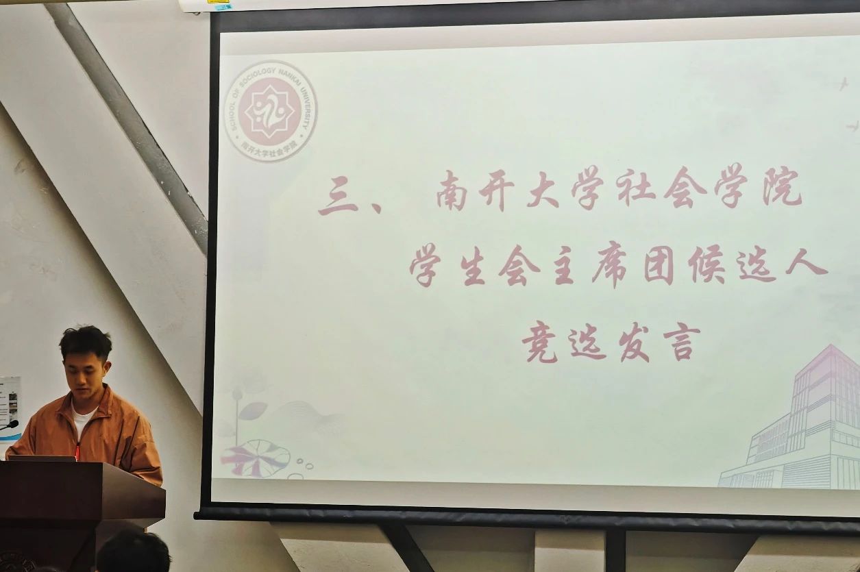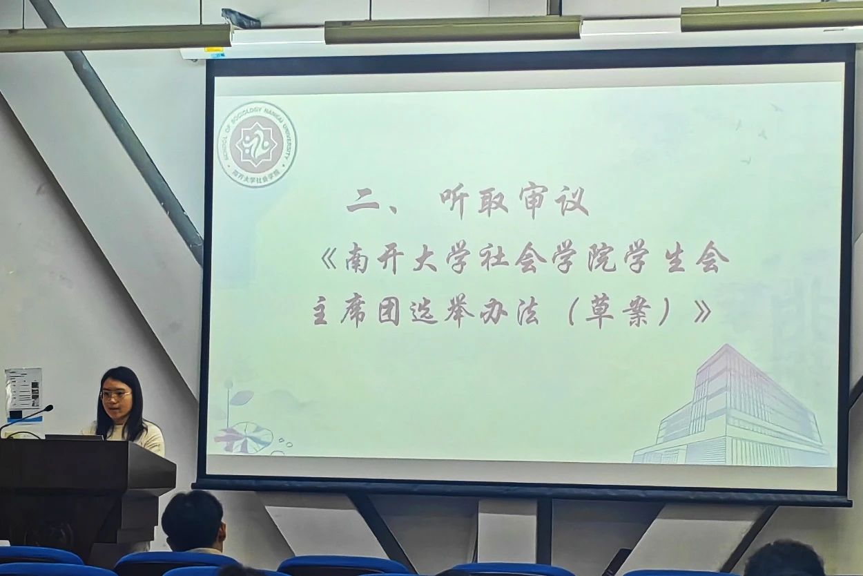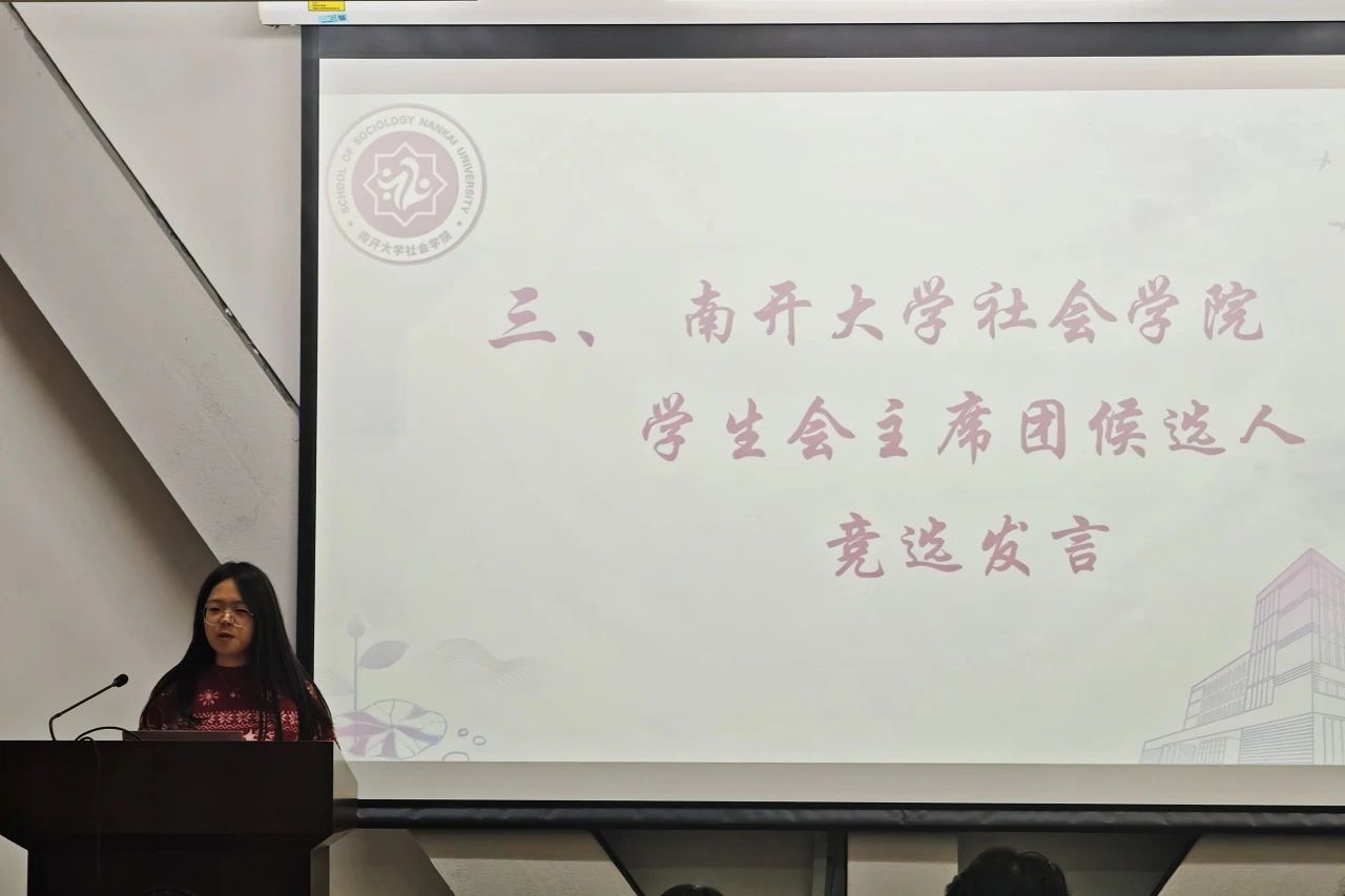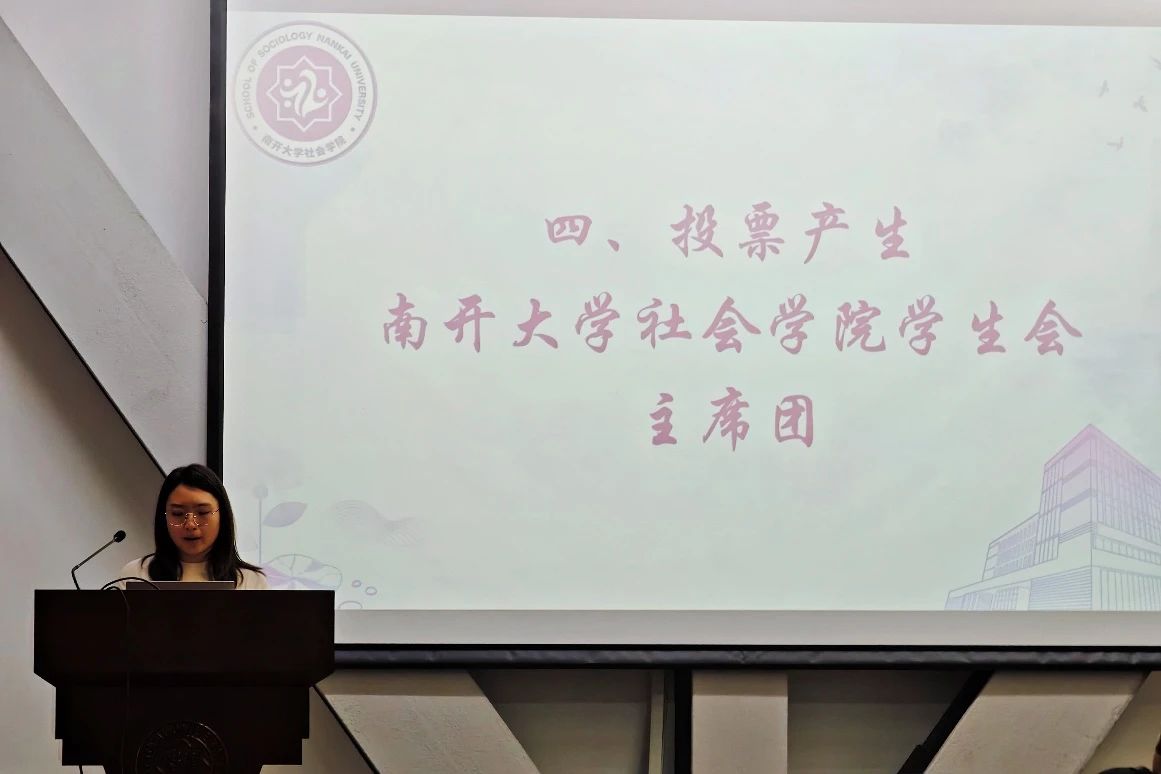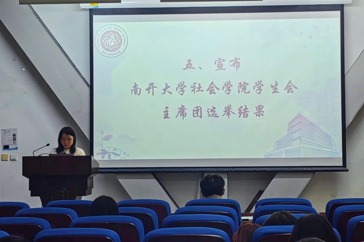 会议议程第五项,由beat365唯一官网2021级本科生陈宇轩宣布beat365唯一官网学生会主席团选举结果,投票选举出beat365唯一官网学生会主席团成员为2022级社会学专业本科生张云茜和2022级社会工作专业本科生代珩。