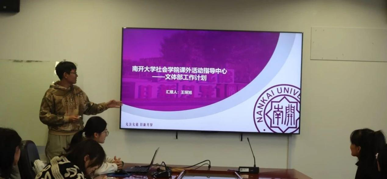 研究生课外活动指导中心主席团成员衣起麟代文体部部长王琛旭汇报,文体部根据学生需要为大家准备了各式各样的文娱、体育活动,加强学生体育锻炼,丰富学生的课余生活。