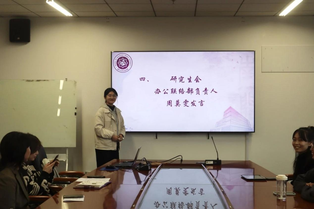 研究生会办公联络部负责人周莫雯从办公和联络两个方面叙述了办公联络部的主要职责,以及从各层级出发,对接校研究生会,以便及时做好学生工作。